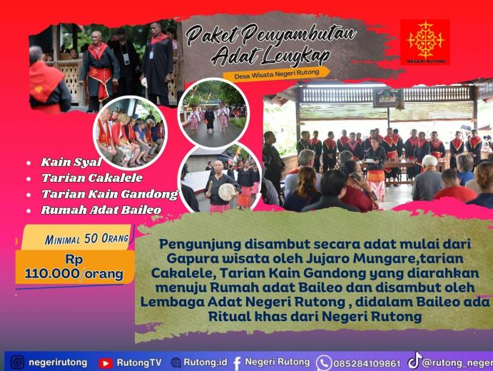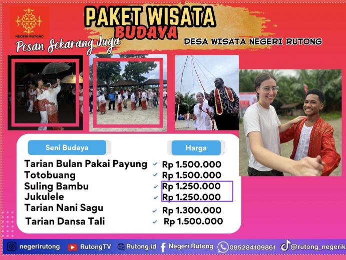 Rutong sebagai negeri adat juga menyuguhkan berbagai atraksi pariwisata yang sekian lama telah menjadi daya tarik pengunjung antara lain Tari Tali (dikenal dengan Dansa Tali), Tari Lenso, Katereji, Cakalele, Ron Pisang dan berbagai atraksi budaya lainnya yang dibawakan oleh anak negeri atau Jujaro Mungare Negeri Rutong. Anda juga dapat berwisata berbagai kuliner khas daerah Rutong seperti Mie Sagu (Metroxylon sagu), Kue Sagu, Snack Sagu yang dikelola oleh Bumdes setempat. Tersedia pula Jus dan Selai Pala (Myristica fragrans), Selai Nanas (Ananas comosus L.) Selai dan Wine Tomi-Tomi (Flacortia inermis) serta Wine Galoba (Hornstedtia alleaceace).